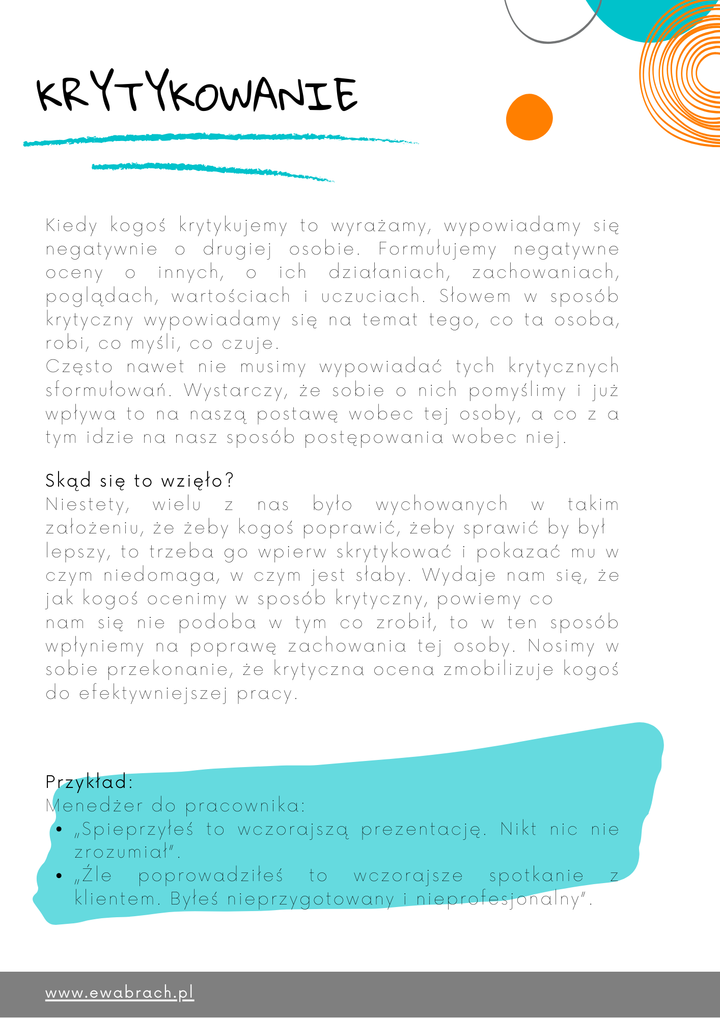 - Przykłady jak to powiedzieć inaczej – konkretne zwroty, pomysły jak daną barierę zastąpić konstruktywnym komunikatem